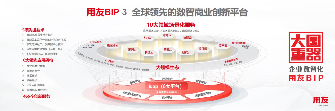 面對(duì)難得的市場和產(chǎn)業(yè)發(fā)展機(jī)遇,用友經(jīng)過6年的規(guī)模研發(fā)、持續(xù)迭代,以全新理念、全新技術(shù)、全新架構(gòu)、全新模式打造了面向企業(yè)和公共組織數(shù)智化的全新一代產(chǎn)品——用友BIP,并在平臺(tái)技術(shù)、應(yīng)用架構(gòu)、創(chuàng)新服務(wù)等方面實(shí)現(xiàn)多項(xiàng)重大突破與升級(jí),達(dá)到全球水平,包括5項(xiàng)技術(shù)、6大應(yīng)用架構(gòu)、465項(xiàng)創(chuàng)新服務(wù),覆蓋智能財(cái)務(wù)、數(shù)智人力、數(shù)智采購、數(shù)智營銷、智能制造、數(shù)智供應(yīng)鏈、數(shù)智研發(fā)、數(shù)智項(xiàng)目、數(shù)智資產(chǎn)及協(xié)同工作等十大核心領(lǐng)域,是目前全球領(lǐng)域覆蓋較多的企業(yè)云服務(wù)群。